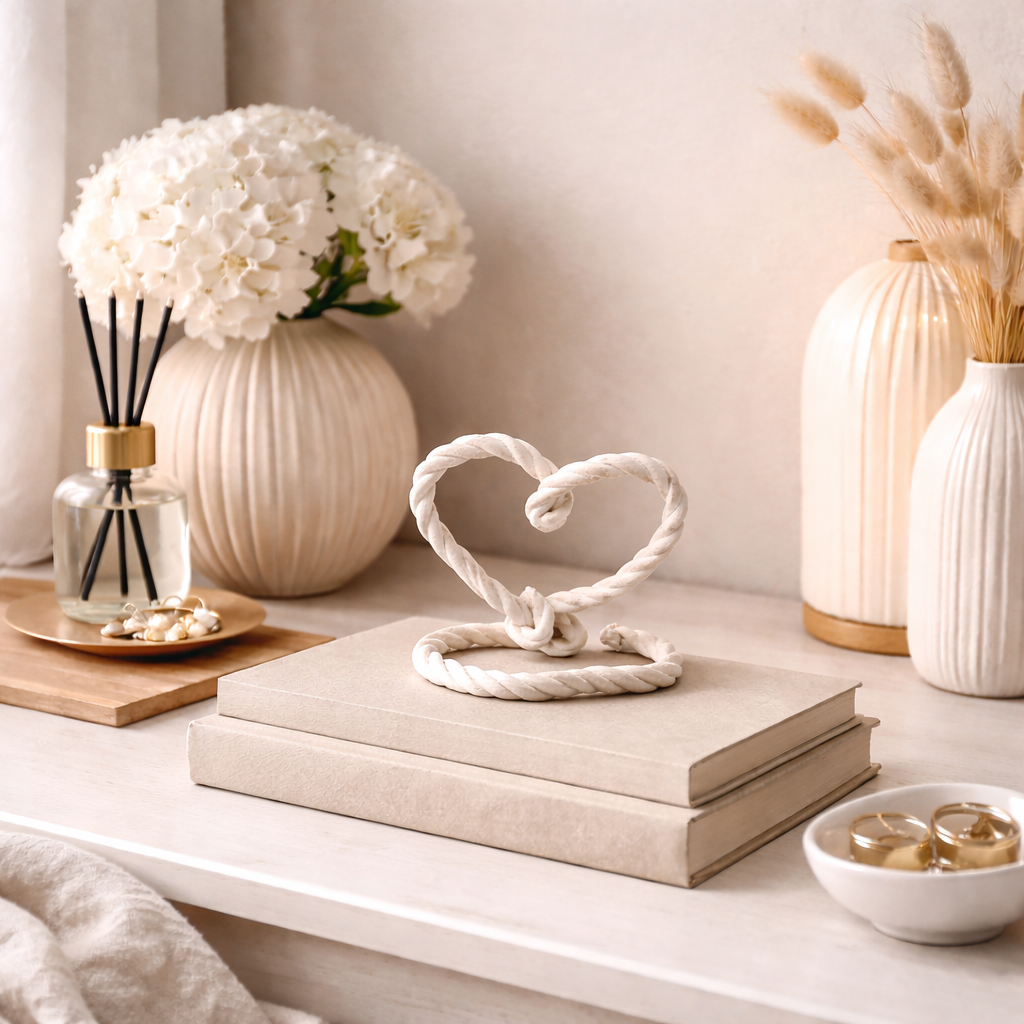 O coração decorativo é perfeito para quem ama uma decoração moderna, minimalista e cheia de significado. Com design elegante e acabamento sofisticado, ele valoriza sua mesa, rack, penteadeira, escritório ou quarto, deixando o ambiente mais aconchegante e especial.