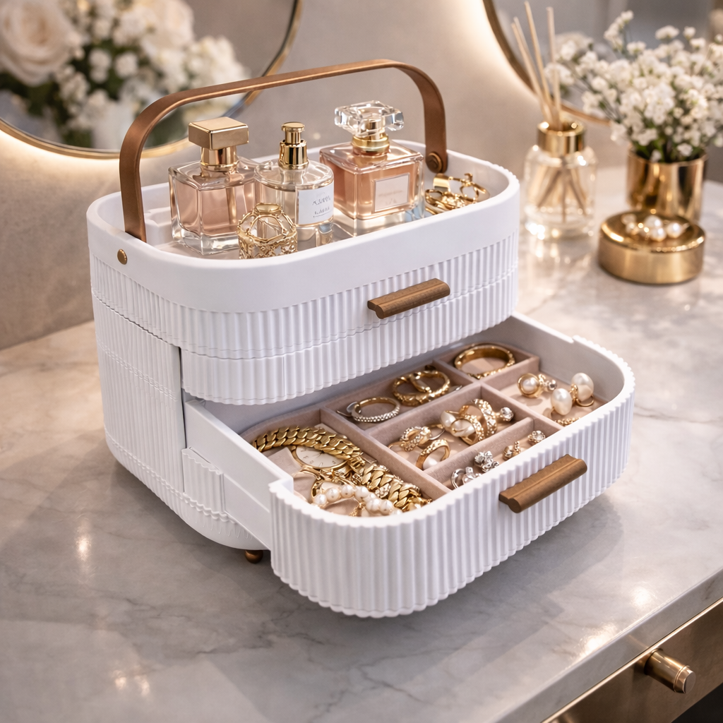 Transforme sua rotina com este Organizador Multiuso Luxo com 2 gavetas, ideal para manter tudo organizado com praticidade e sofisticação. Seu design moderno em branco com detalhes em marrom traz um toque premium ao ambiente, combinando perfeitamente com banheiros, penteadeiras, quartos e closets.